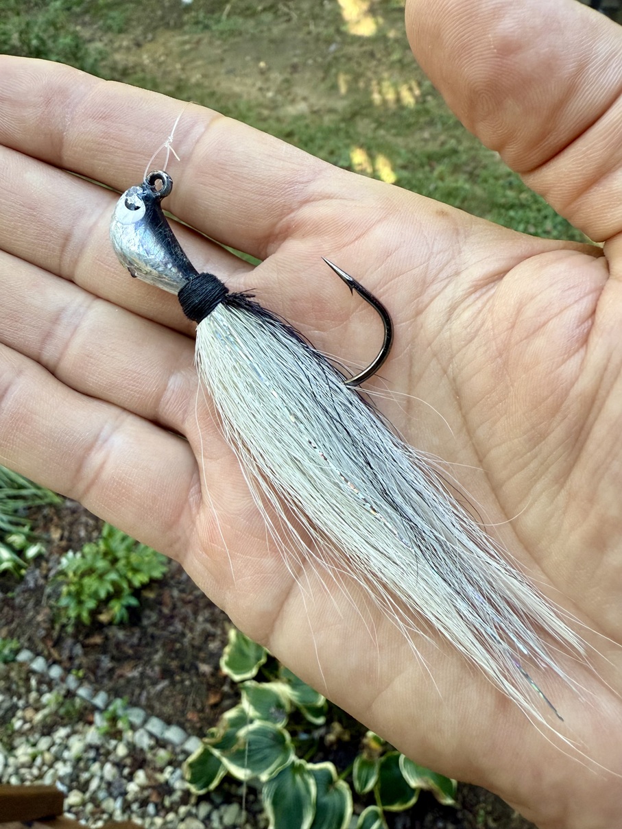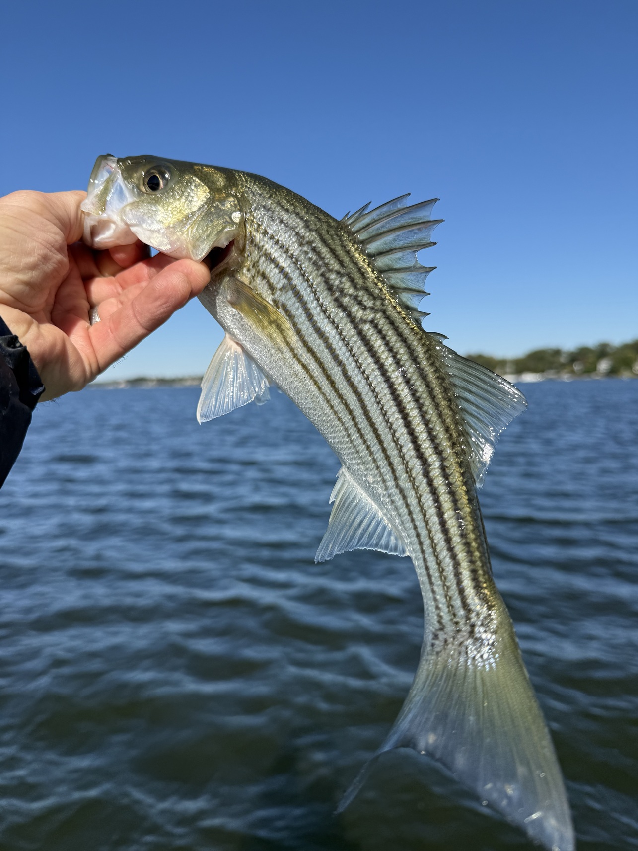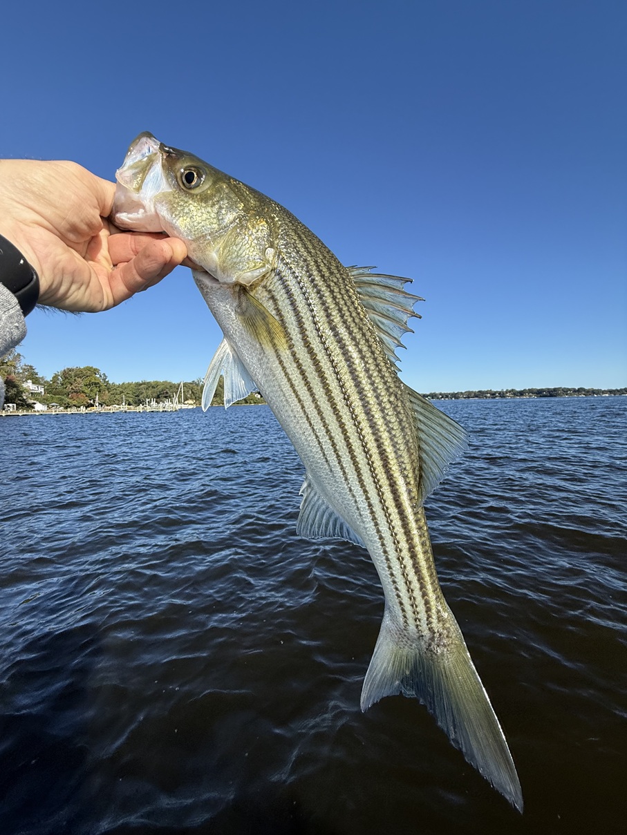 The wind was pushing me along my hopeful path, but more so toward the docks/shoreline, which put my trolling motor to the test. The good news is I managed to make some casts as I intended. With a heavy chop on the surface water, the fish were sitting deep and closer to the bottom along the dropoff in about 15 to 20 feet of water. I managed to cast the bucktail at one particular set of deep pilings at the end of a pier and pull up a two-foot (24”) striper. This was the exact class of fish I was hoping to find, and a great indication that good fish were moving into the river. I also caught a 17” fish before I had to call it quits due to high winds making it too difficult to hold position and continue fishing.