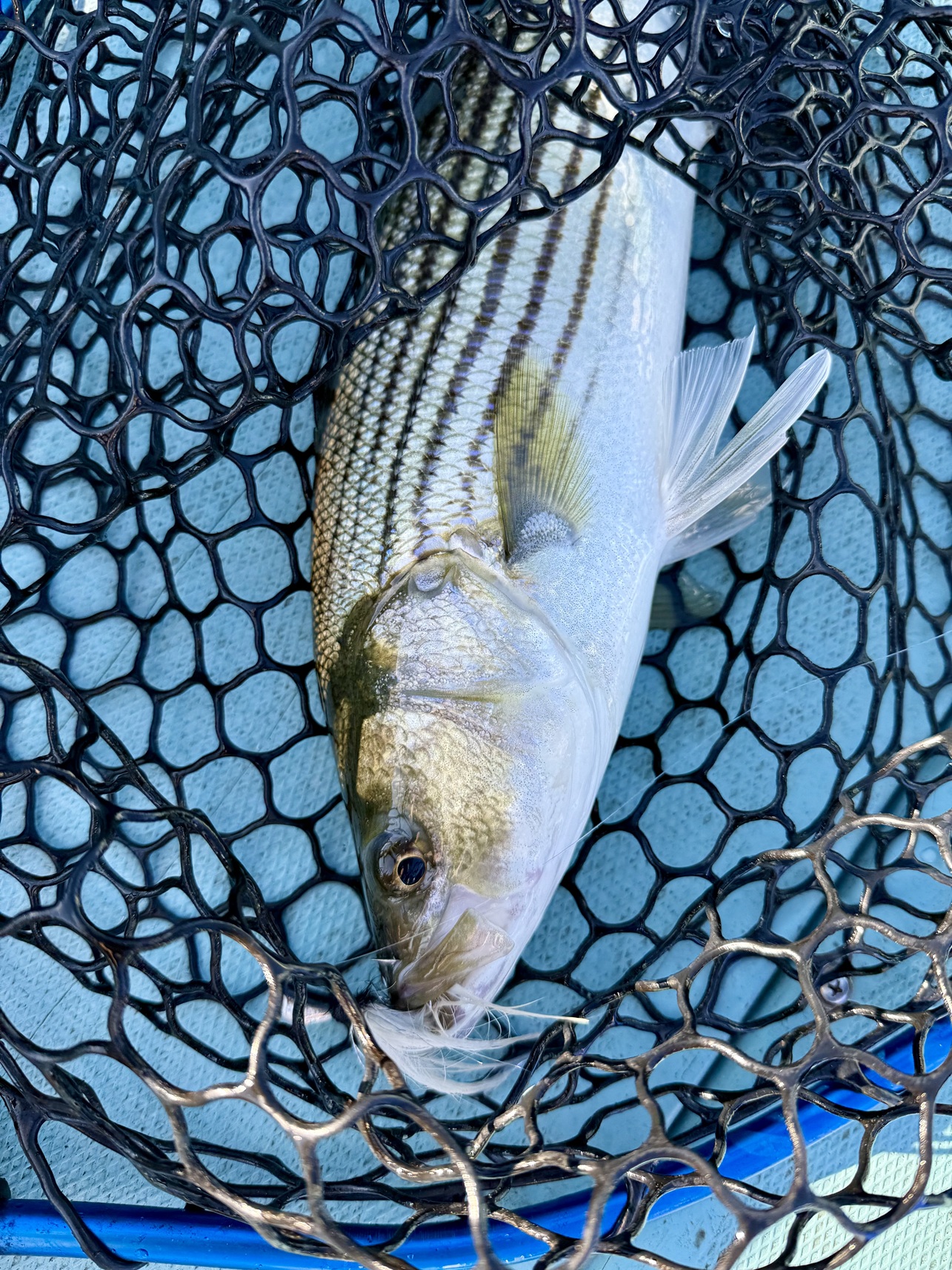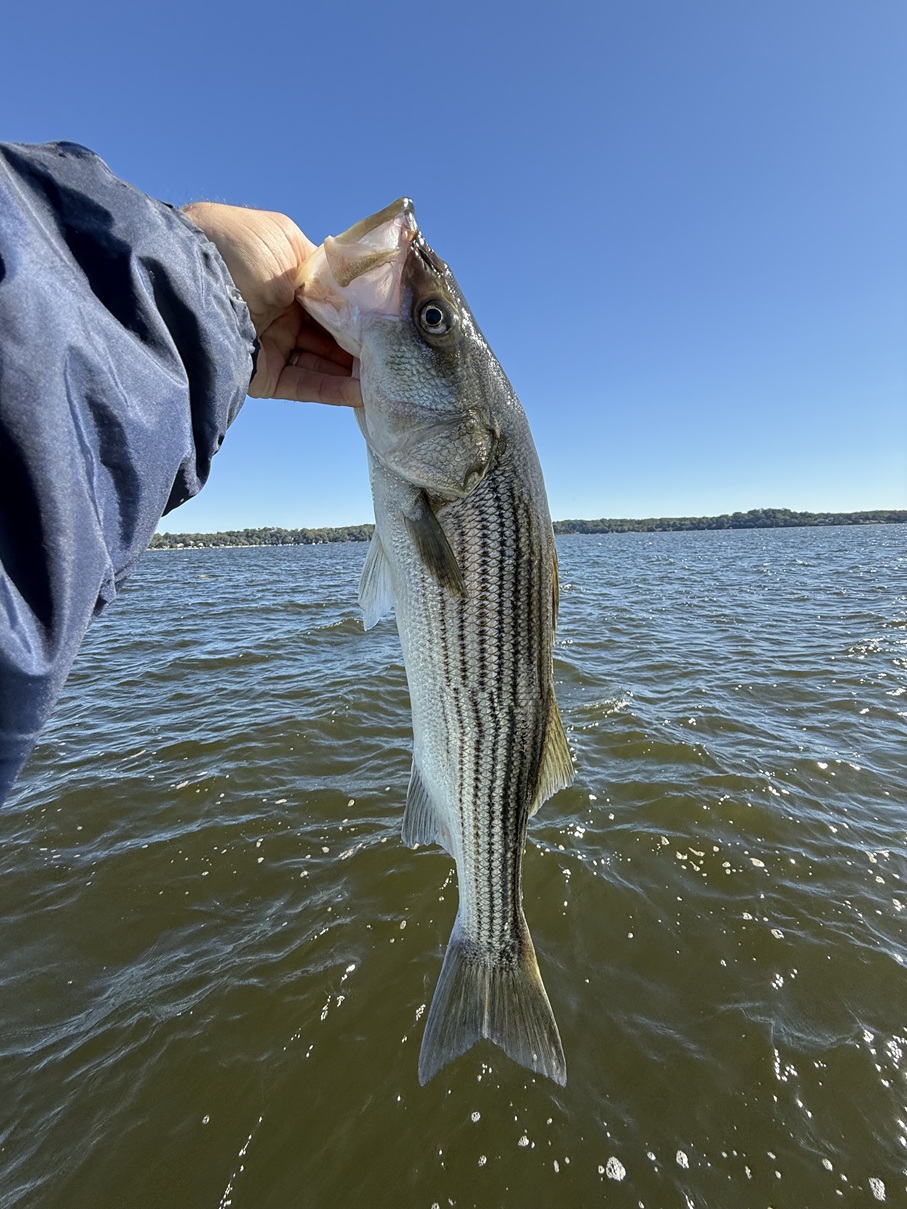 The wind was pushing me along my hopeful path, but more so toward the docks/shoreline, which put my trolling motor to the test. The good news is I managed to make some casts as I intended. With a heavy chop on the surface water, the fish were sitting deep and closer to the bottom along the dropoff in about 15 to 20 feet of water. I managed to cast the bucktail at one particular set of deep pilings at the end of a pier and pull up a two-foot (24”) striper. This was the exact class of fish I was hoping to find, and a great indication that good fish were moving into the river. I also caught a 17” fish before I had to call it quits due to high winds making it too difficult to hold position and continue fishing.