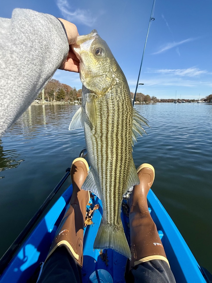 This first November outing was a bit trying and I only encountered one chasing pickerel, having effectively worked through an entire stretch of shoreline with a few laydown trees and several docks. I was using a 2” micropaddletail on an 1/8oz jighead. My other go-to lure, which is more of a search bait, is a 1/4oz inline spinnerbait with a single-hook bucktail trailer. With no fish in the shallows, I repositioned in deeper water (about 10–12’) off a sandy point and fished the jig near the bottom in hopes of finding some yellow perch. I worked the light jig gently and felt a tap, then a thump…and drag began to peel off quickly from my light 1500 class reel/setup. I thought “large pickerel,” but the deepwater pull and slow, sweeping headshakes gave away that it was a nice-sized striper!