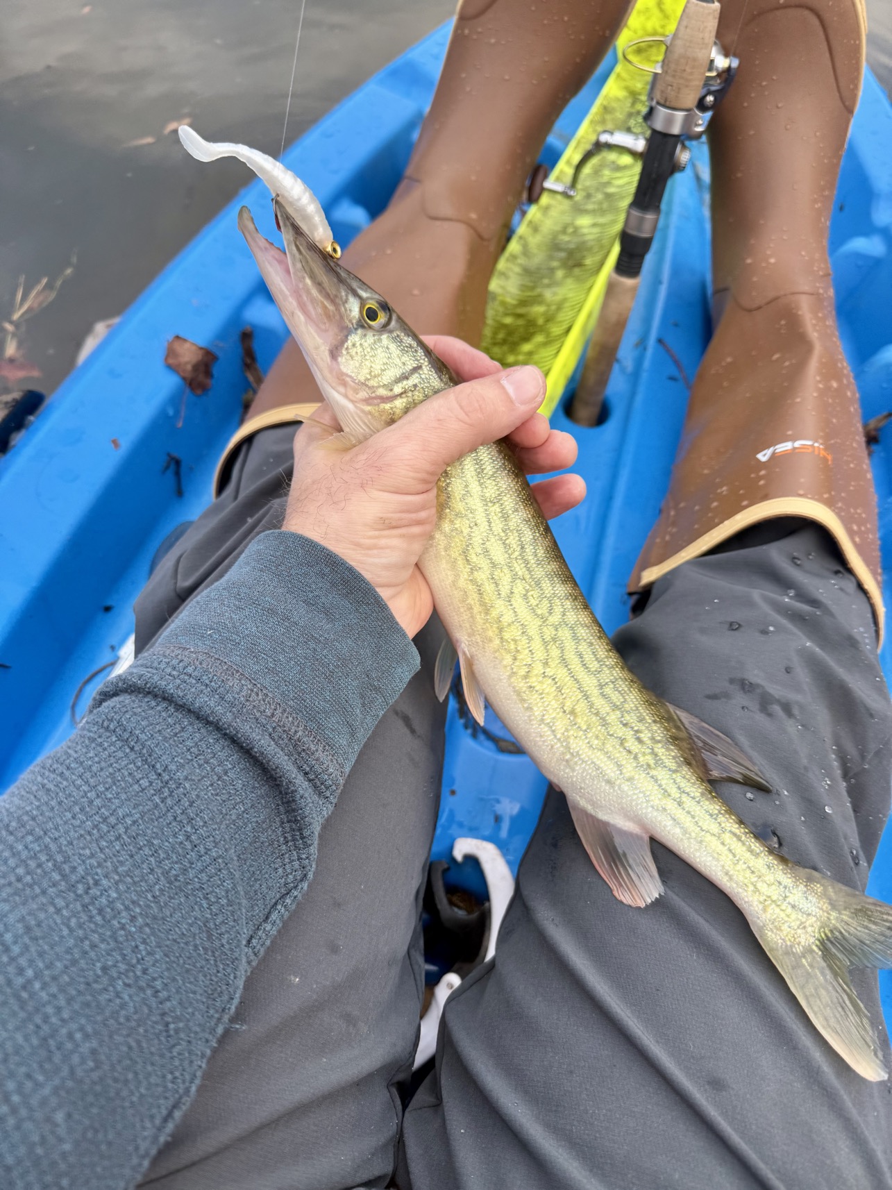 The very next afternoon, I decided to see if this pattern would repeat. So, to the back of the creek I paddled. Same gear, same setup, same white paddletail. Same results. Great fishing in the late-afternoon with multiple hookups and several good-sized pickerel landed. The largest was about 22.75” which is nice but just short of trophy size (24”). With a pattern in hand and one that could be repeated if the conditions are right (I’m eyeballing the next new moon phase), I’ll have a shot at more fish—and maybe a trophy—during the best pickerel fishing of the year. And though the yellow perch haven’t shown themselves yet—at least at this particular spot—I look forward to finding some nice specimens in, perhaps, other Severn creeks.